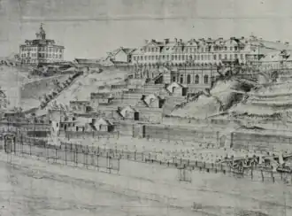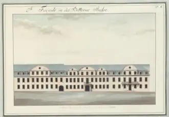 The Bellevueschloss palace complex was located between the Schöne Aussicht, the Frankfurter Strasse, and the Fünffensterstraße. The building complex consisted of several 18th century palaces and private houses, including: