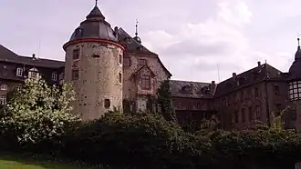 Schloss Laubach is first mentioned in a list of properties of the Hersfeld monastery in 786 C.E. The Hagen-Münzenberg family were granted the authority over Laubach as a fief. A castle was built in the thirteenth century. In 1255 the estate was granted to the Lords of Hanau, and later it was owned by the Counts of Falkenstein.[1] The Counts of Solms-Laubach bought the castle in 1418. Frederick Magnus I, Count of Solms-Laubach made the castle the official residence of the House of Solms-Laubach. In 1475 Kuno, Count of Solms-Laubach was granted permission by Frederick III, Holy Roman Emperor to add fortifications to the castle and the surrounding town.[2] The architect Licher Baum Wolff Werner rebuilt the castle towers in 1533. The castle is made up of three horseshoe-shaped buildings that interlink. Three of the four original fortified round towers still stand, and baroque hoods were later added onto them.[3]