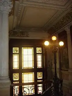 In the stairwell between eight large pilasters painted landscapes and architectural motifs from the Mosel region created by Karl Julius Grätz are located. The stairwell window with lead glazing has four painted medallions of Binsfeld and Janssen in Trier. The staircase itself is a self-construction of Trier sandstone with wrought-iron, partly gilded railings.