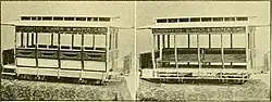 One was a winter car that could readily be converted to an open car by the removal of the outer panels, which were made in sections and held in place at the bottom with two dowels and locks, which operated with a button at either side of each panel. These panels had rubber casings to prevent rattle and jar and make them perfectly tight. When the box car became an open one by removing the panels, the seats were turned over so as to face outward while extending lengthwise as in a closed car. This left space for the conductor to pass through for collections.[1]