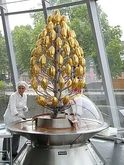 - A special attraction is the 3-metre (9.8 ft) tall chocolate fountain; an employee dips wafers into the liquid chocolate and distributes them to the visitors.