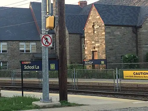 School Lane station is a station on the D in Drexel Hill, Pennsylvania. It is located on School Lane west of Edmonds Avenue. The station is next to Grace Lutheran Church on the northwest corner of the aforementioned intersection.