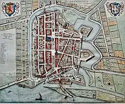 Between 1582 and 1601 the city's defense walls were renewed and expanded to include the shipyards as well. At this point, the fortifications mainly faced eastward (as can be seen on the 1652 map of Schoonhoven by Joan Blaeu), because of the historically strategical location on the border between the County of Holland and the Bishopric of Utrecht. Following the Disaster Year of 1672, they were reinforced once again and expanded on the west and north sides. Yet in 1816, when bastion fortifications were no longer relevant to the warfare of the time, they were mostly demolished and made way for a cemetery and a park. Nowadays, most of the town walls and gates too have disappeared. The only remaining medieval entrance gate of Schoonhoven is the Veerpoort (Ferry Gate) that faces the Lek River. This Veerpoort has protected Schoonhoven from the floods of the river Rhine and from the sea during the devastating North Sea flood of 1953 and is still fully functional as a water barrier today.