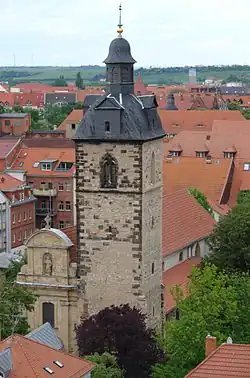 The three-aisled basilica is Romanesque in origin and partly Gothic in style. The Benedictine monastery was founded in 1136[2] by the brother of the Naumburg bishop Hildeward, Walther von Glisberg, whose gravestone is on display in the church. It shows the imperial ministerial, who was propertied at the Kunitzburg in Jena, and his wife in the style of Romanesque depictions of persons. He was also Vogt of his foundation.[2] The monastery was a branch monastery of the Abbey of St James in Regensburg, founded by Marianus Scottus, from which the present name Schottenkirche is derived (Schotten is German for "Scots"). By 1200, the building work was completed and the monastery church finished. In the early 13th century, the western nave bay was replaced by Early Gothic arcades.[3] First in 1299, then again in 1472, the great Erfurt city fire destroyed parts of the church, which were subsequently rebuilt in Gothic forms, reusing some of the old stones which are still distinguishable today.[3] Various architectural and decorative elements refer to the Iro-Scottish origin. The choir shows Gothic forms from the time after the second church fire in 1472.
