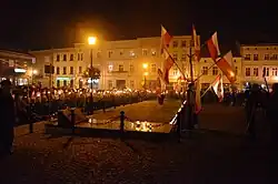 Śrem was bombed by Germany on 1 September 1939, the first day of the invasion of Poland, which began World War II.[2] During the German occupation, the Polish population was subjected to mass arrests, imprisonment, executions, expulsions, and deportations to Nazi concentration camps. In September 1939,[3] the Einsatzgruppe VI carried out mass arrests of Poles, many of whom were immediately murdered.[4] The Einsatzgruppe VI carried out public executions of Poles from Śrem and nearby villages on 20 September and 20 October 1939, killing 20 and 19 people respectively, including former Polish insurgents of 1918–1919, local administration and court officials, merchants, and landowners.[5] The Polish resistance movement was quickly organized in the town, incl. the Dla Ciebie Polsko ("For You, Poland") organization founded by a local teacher in October 1939, and later also the Home Army.[6] 12 Poles arrested in Śrem were executed in the nearby village of Zbrudzewo on 8 November 1939.[2][7] Further mass arrests of 45 Poles, mostly teachers, were carried out in May 1940, and most were then deported to the Mauthausen and Dachau concentration camps, and murdered there.[8] In 1939 and 1940, the Germans expelled hundreds of Poles, who were deported to the General Government in the more-eastern part of German-occupied Poland, and their houses were then handed over to German colonists as part of the Lebensraum policy.[9] After the end of German occupation, the town was restored to Poland, although with a Soviet-installed communist regime, which stayed in power until the Fall of Communism in the 1980s.