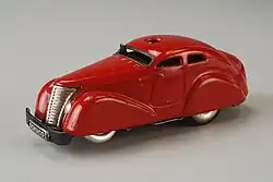 In 1935 one of the first Schuco patent motor cars was produced, starting a legacy of producing toy motor vehicles that have usually been the company's main offering. Schuco toy lines always had some special quality or gimmick to attract collectors as well as children. Around 1938, production was begun on tin cars that were made either with clockwork motors or 'telesteering' where the toy could be steered through a small steering wheel attached to the car with a wire.[5]