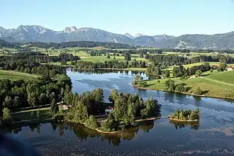 The Schwaltenweiher is a reservoir in the Ostallgäu foothills of the Alps in Bavaria, Germany. It lies 14 km (8.7 mi) from the Allgäu Alps between the towns of Seeg and Rückholz. It was named after the Schwaltenmühle mill built beside it, which was in turn named after the Schwalt or Schwald family. It is now used for bathing and fishing.