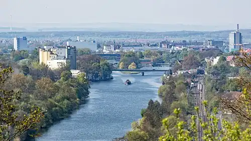 Most of the postwar construction projects were realized under the aegis of Mayor Georg Wichtermann (SPD, 1965–1974), in the city governed by the SPD by an absolute majority. Numerous new residential districts were created. By the Jump over the River Main (starting from 1963)[7] developed south of the Main River the commercial park Port East and the new industrial area Port West. The infrastructure was expanded, with the Main Port (1963) and today's University of Applied Sciences Würzburg-Schweinfurt (1971).