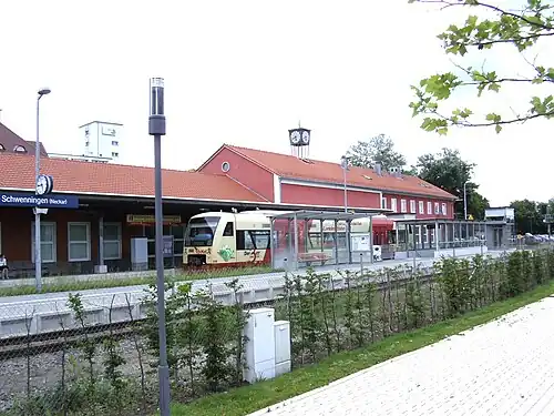 Schwenningen (Neckar) station is one of two stations in Villingen-Schwenningen in the German state of Baden-Württemberg. The other is Villingen (Schwarzwald). Schwenningen owes its connection to the railway to Johannes Bürk, who had demanded a route through Schwenningen to promote the local watch industry, which included his own factory. The original plans involved a route through Niedereschach.[4] The station is located at the Neckar, south of central Schwenningen. It is located at 695 metres (2,280 feet) above sea level on the Rottweil–Villingen railway. Originally the station was 540 metres (1,770 feet) long and up to 56 metres (184 feet) wide. The complex included a station building and a goods shed.[5]