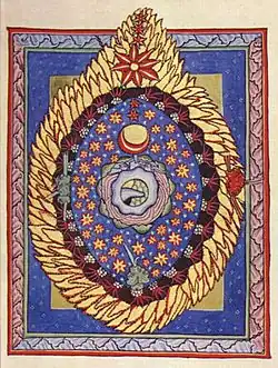 Scivias survives in ten medieval manuscripts, two of them lost in modern times.[4] The most esteemed of these was the well-preserved Rupertsberg manuscript, prepared under her immediate supervision or that of her immediate tradition, being made around the time of her death. It resided in the Wiesbaden Hessische Landesbibliothek until World War II,[5] when it was taken to Dresden for safekeeping, and lost.[6] The original manuscript was 12.8 by 9.25 inches (32.512 by 23.495 cm), and in 235 parchment pages with double columns.[6] A faithful illuminated copy was made at the Hildegard Abbey in Eibingen in 1927-1933, which is the source of the color reproductions now available. Other copies are in the Biblioteca Vaticana (made in Rupertsberg), Heidelberg (12th century), Oxford (12 or 13th century), Trier (1487), and elsewhere.[5]