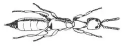 Males have wings but lack a stinger. Females are 2–5 mm long; they have a stinger but lack wings. They are black/brown, and have the appearance of ants. Females enter woodworm holes, paralyze the woodworm larvae with the venom of the stinger and lay their eggs in the corpses, which form the food for the S. domesticus larvae. This behavior leads to the common name of "antiquarian's friend".