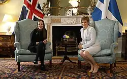 Following a referendum on devolution proposals in 1997, the Scotland Act 1998[102] was passed by the British Parliament, which established a devolved Scottish Parliament and Scottish Government with responsibility for most laws specific to Scotland.[103] The Scottish Parliament was reconvened in Edinburgh on 4 July 1999.[104] The first to hold the office of first minister of Scotland was Donald Dewar, who served until his sudden death in 2000.[105]