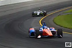 CGR returned to Honda engines before the 2017 season after three seasons with Chevrolet.[113] Dixon finished third at St. Petersburg, Barber, and the Indianapolis road course in his first five races.[28] He qualified on pole for the Indianapolis 500; during the race, he crashed airborne into the inside barrier after hitting Jay Howard's left-rear wheel on lap 53. Dixon and Howard were unhurt.[114] He took the championship lead from Castroneves by finishing second in the first race of the Chevrolet Detroit Grand Prix doubleheader,[115] and won the Kohler Grand Prix at Road America three races later.[116] He finished no lower than tenth in the next six races, including consecutive second places at Gateway Motorsports Park and Watkins Glen, and was three points behind championship leader Josef Newgarden heading into the season-ending GoPro Grand Prix of Sonoma.[28][117] Dixon finished fourth, putting him third in the final championship standings with 621 points.[118]