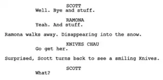 Bacall said that he wanted to write the Scott Pilgrim film because he felt strongly about its story and empathized with its characters.[16] Wright said that O'Malley was "very involved" with the script of the film from the start, contributing lines and adding polish. Due to the long development, several lines from various scripts written by Wright and Bacall were used in later Scott Pilgrim comics.[17] The screenplay's second draft, which O'Malley said "became the main draft for the film", was submitted right at midnight on the night the Writers' Strike was supposed to begin in October 2007.[18] No material from Scott Pilgrim's Finest Hour, the sixth Scott Pilgrim volume, appeared in the film, as the comic was not complete at the time of the film's production; O'Malley contributed suggestions for the film's ending and gave the producers his notes for the sixth volume,[19] but stated that the film's ending was "their ending".[20] Some ideas for the film's ending were cut before production, including that Scott would turn out to be a serial killer who fantasized the gaming aspects[21] and that Gideon would turn into a Transformers-style robot.[22]