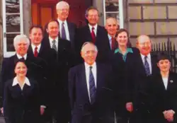 During the premiership of Henry McLeish who succeeded Dewar as first minister in 2000 following Dewar's sudden death, he retained the "minister" titles for members of his cabinet. The McLeish cabinet formed in October 2000 and was dissolved in November 2001 following the resignation of McLeish amongst a political scandal relating to finances.[4] The First McConnell government was formed by first minister Jack McConnell on 27 November 2001 following his appointment as first minister following the resignation by Henry McLeish,[5] and was dissolved on 20 May 2003 following the 2003 Scottish Parliament election.[6] McConnell formed his second cabinet on 20 May 2003 and was dissolved on 16 May 2007, whereby it was replaced by the First Salmond government following Alex Salmond's election victory in the 2007 Scottish Parliament election.[7]