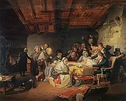 Less well known contemporaries of Wilkie that pursued genre art included William Home Lizars (1788–1859), who was a student with Wilkie at the Trustees Academy. He exhibited two genre paintings in 1811: A Scotch Wedding and The Reading of the Will, which demonstrate humour and seem to relate to the early work of Wilkie, who painted his own version of the later in 1820. Shortly after this Lizars turned to engraving for a living.[8] William Shiels (1785–1857) is mainly known as an animal painter, but he also created genre art. James Howe (1780–1836) also undertook genre art with an agricultural dimension. Most influenced by Wilkie were his close friends John Burnet (1784–1868), William Allan (1782–1850), Alexander George Fraser (1786–1865) and Andrew Geddes (1783–1844). The first three were all contemporaries of Wilkie at the Academy, while Geddes was self-taught. Burnet and Fraser worked closely with Wilkie in London, while Geddes and Allan stayed in touch with him throughout his career. Allan became Master of the Trustees Academy and later President of Royal Scottish Academy and so was able to pass on Wilkie's influence. He produced genre paintings including Christmas Eve (undated), which is a variation on Wilkie's A Penny Wedding.[9]