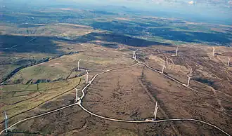 Scout Moor is an upland moor of peat bog and heather in the South Pennines,[3] reaching a maximum elevation of 1,552 feet (473 m) at its peak, Top of Leach.[7][8] The underlying geology – a mixture of hard rock and soft shales – broadly belongs to the Lower Coal Measures. The rock and shales weather at different rates, giving the area a landscape of "steep escarpments separated by sloping shelves", although the main dome of the moor is flat and rounded.[8] The moorland covers an area of about 1,347 acres (545 ha),[9] of which less than 21 acres (8.5 ha), about 2%, is occupied by the wind farm.[10]