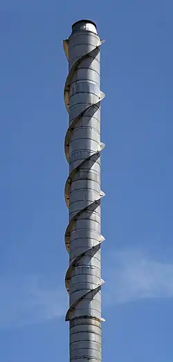 Helical strakes are fins that follow a helix down a structure;[1] they are commonly used on cylindrical bodies[2] such as chimneys and pipelines. Starting with screw heads, strakes continue along the structure and disrupt the vortexes that form as a result of fluid flow[3] by ensuring that flow is shed at different heights and no structured vortexes can be formed.[4] In this manner, strakes reduce vibrations and mitigate fatigue;[5] multiple strakes are often used, as this minimizes the possibility of alternate vortexes forming.[6] They may be used on their own, or in conjunction with other devices such as fairings.[3]