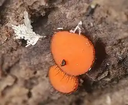 The species resembles the abundant Scutellinia umbrorum and can only be reliably identified by microscopic features.[4] Found in Europe, S. olivascens forms clusters of orange discs up to 1.5 cm in diameter on soil or rotting wood in summer and autumn.[4]
