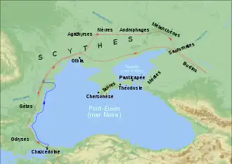 Within this broad use, the Scythians proper who lived in the Pontic Steppes are sometimes referred to as Pontic Scythians.[1][26]