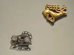 Scytho-Siberian art is the art associated with the cultures of the Scytho-Siberian world, primarily consisting of decorative objects such as jewellery, produced by the nomadic tribes of the Eurasian Steppe, with the western edges of the region vaguely defined by ancient Greeks. The identities of the nomadic peoples of the steppes is often uncertain, and the term "Scythian" should often be taken loosely; the art of nomads much further east than the core Scythian territory exhibits close similarities as well as differences, and terms such as the "Scytho-Siberian world" are often used. Other Eurasian nomad peoples recognised by ancient writers, notably Herodotus, include the Massagetae, Sarmatians, and Saka, the last a name from Persian sources, while ancient Chinese sources speak of the Xiongnu or Hsiung-nu. Modern archaeologists recognise, among others, the Pazyryk, Tagar, and Aldy-Bel cultures, with the furthest east of all, the later Ordos culture a little west of Beijing.[11][12][13][note 1] The art of these peoples is collectively known as steppes art.