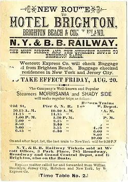 In the early morning of July 27, 1881 the Brighton Beach terminal was completely destroyed by a fire of incendiary origin with a loss of $35,000 which were only partially covered by insurance. Half of the rolling stock, seven cars at an estimated value of $16,000, were also destroyed.[1] The track was sold in 1884 and renamed in 1886 to Sea Beach & Brighton Railway. It was subsequently used by the Boynton Bicycle Railroad for two years starting in the summer of 1890.