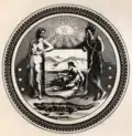 Below and partly within the semicircular inscription 'City of New Orleans' an Indian brace and maiden stand on each side of the shield, upon which a recumbent nude figure is shown saluting the sun rising above mountains and sea. Above the shield are twenty-five circularly grouped stars, and below, an alligator.