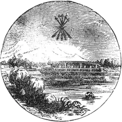 In the meantime, a wide array of designs emerged,[16] particularly on court seals. Common embellishments included a plow and recumbent sheath of wheat, a range of mountains instead of a single peak (as in the Creighton seal), and an "ark" (a broad horn flatboat with a roof) floating on a river (understood to be the Ohio River, quite a distance from Chillicothe).[17][18] The 1847 seal depicted in the Statehouse rotunda skylight substitutes the Ohio with a canal, replete with a canal boat.[19] In an 1860s version, the arrows levitate among the clouds. Besides artistic liberty, some seals reflected confusion over the state's founding year, which was popularly believed to be 1802, the year the original constitution was adopted.[5]