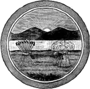 The design was traditionally said to depict the view from U.S. Senator Thomas Worthington's Chillicothe-area estate, Belle View: in 1803, Creighton emerged from an all-night meeting at the estate and saw "the rising sun of the new state" just beyond Mount Logan.[8] Creighton and Worthington both belonged to the "Chillicothe Junto" that dominated early state politics.[10] However, most historians regard the story to be apocryphal, noting that the sun, mountains, and agricultural implements were common in seals of that era.[11] Regardless, the present seal does represent the view from Worthington's estate, now known as Adena, as a matter of law.