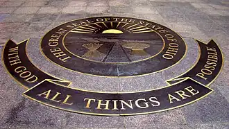 The Great Seal of the State of Ohio is the official insignia of the U.S. state of Ohio. All governmental offices, agencies, and courts in Ohio use variations of the state seal. Its primary feature is a circular coat of arms that depicts a sunrise in Chillicothe, Ohio's first capital, along with symbols of the state's origins. The seal sometimes appears with the state motto, "With God, All Things Are Possible".