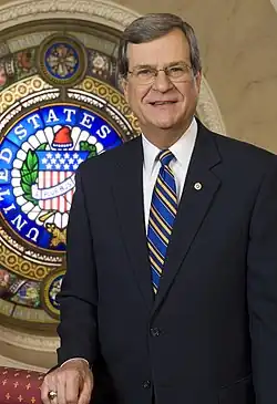 Trent Lott posing next to the Senate seal