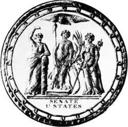 12. ^ In 1885, Senator William P. Frye remarked "The Senate is without any official seal. There is only a legend of one, three women very slightly clothed, but it is only a legend." (noted in the Congressional Record, vol. 17, p. 96.) The final report for the new seal, after the earlier seal had been found, then said "No one has yet ever discovered what these figures were intended to typify, or what relevancy they had to the United States Senate or its proceedings." (Senate Report No. 48, 49th Congress, 1st Session.) This confusion was probably aided by the worn condition of the seal, which obscured several features which would have made the meaning more obvious.