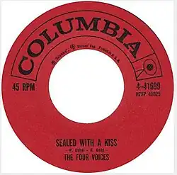 "Sealed with a Kiss" is a song written and composed by Peter Udell and Gary Geld. The original recording of "Sealed with a Kiss" was by the Four Voices which was released as a single in May 1960 without becoming a hit.[1] It first became a hit in 1962 for Brian Hyland and later Jason Donovan had an international number one hit with the song in 1989.