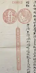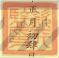 It wasn't until the year Minh Mạng (1822) that rules were laid out for how, when, and where seals had to be used on official documents.[8] Modern scholarship based on the books "Khâm định Đại Nam hội điển sự lệ" and "Minh Mệnh chính yếu" concluded that the first stamps of a document were reserved for the Thủ tín thiên hạ văn vũ quyền hành, Quốc gia tín bảo, Văn lý mật sát, Ngự tiền chi bảo.[8] These imperial seals were all cast in either gold or silver and were considered to be national treasures.[8] Gold seals were often prominently placed on the era dates to signify the importance of the Emperor and the official nature of the document.[8] The Văn lý mật sát seal was used to enclose important words, corrections, and revisions of different versions, threads, chapters, and books.[8] The role of this precaution was to re-verify the corrections, fixes, additions, and to avoid unlawful fabrication.[8] Separate rules also existed for when a seal was allowed to be stamped with either red ink or black ink.[13]