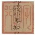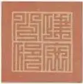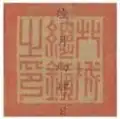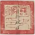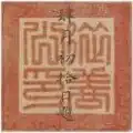 Inscriptions used by previous dynasties were at times also re-used when producing new imperial seals.[23] For example, an imperial seal with the inscription Sắc mệnh chi bảo (敕命之寶) was first created at the time of the Mongol invasions of Đại Việt and Champa during the reign of Trần Thái Tông of the Trần dynasty and was used to stamp documents ordering or declaring royal (or imperial) ordinances during the early days of the war.[23] The Trần dynasty period Sắc mệnh chi bảo seal was made of wood, but later versions of the Sắc mệnh chi bảo were primarily made of silver and gold.[23] Precious metal Sắc mệnh chi bảo seals were made during Later Lê, Mạc, Revival Lê, and Tây Sơn dynasties.[23] Under Minh Mạng a Sắc mệnh chi bảo seal was made for the Nguyễn dynasty, this seal was used on imperial ordinances until 1945.[23] Furthermore, the seals of the Nguyễn lords such as the Thủ tín thiên hạ văn vũ quyền hành (取信天下文武權行, "Win the trust of all under heaven, seal for military texts.") also remained in common use until the year Minh Mạng 9.[8]