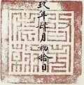 The first known seal of the Nguyễn lords had the inscription Trấn thủ tướng quân chi ấn (鎮守將軍之印, "Seal of the guardian general") and is found on letters signed by the An Nam quốc thiên hạ thống đô nguyên soái Thụy quốc công (安南國天下統兵都元帥瑞國公).[14][b] This seal is known to have been produced under Nguyễn Phúc Nguyên and was used on documents created when interacting with the Tokugawa shogunate (Edo period Japan).[14] This is one of the few lost seals of the Nguyễn (alongside the Hoàng Đế chi bảo) and the little evidence of its existence is found on a document with this seal attached to it dated with the reign era of Emperor Lê Dụ Tông of Bắc Hà is kept at the Japanese archives in the Edo Castle, Tokyo.[14]