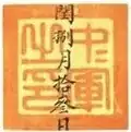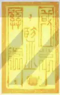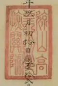 The Kiềm ký (鈐記) seal type was used by low-level mandarins and military commanders in charge of estuaries, border gates, small boat fleets, passes, Etc.[8] It was usually stamped on the "month" (月, nguyệt) part of the date present on a document.[8] Another feature of some Kiềm ký type of seals is that many of these seals had inscriptions written in Traditional Chinese characters as opposed to seal script.[8]