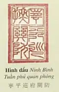- ^ Nguyễn Công Việt - Ấn Chương Việt Nam (NXB Khoa Học Xã Hội 2005), Tổ chức quân đội và ấn dấu của một số danh tướng đầu thời Nguyễn. Quote: "Quả ấn duy nhất thuộc quân binh còn lưu giữ tại Viện Bảo tàng Lịch sử Hà Nội. Ấn có ký hiệu LSb 2524 bằng đồng, cán chuôi vồ thắt đáy, cao 7cm, dầy 1,2cm, mặt ấn có ghi niên đại tạo ấn vào năm Minh Mệnh thứ 16 (1835) và trọng lượng ấn nặng 12 lượng. Dấu ấn hình chữ nhật cỡ 7,8x4,8cm, 8 chữ Triện khắc rõ nét: Hưng Hóa phó lãnh binh quan quan phòng 興化副領兵官關防 chữ xếp theo chiều dọc 3 hàng, hàng giữa dài gấp rưỡi chữ hàng bên. Đó là Quan phòng của quan Phó Lãnh binh tỉnh Hưng Hóa. (H. 149 a,b,c)". (in Vietnamese).
