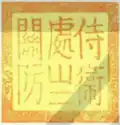 The Quan phòng (關防) type seal appeared from the Gia Long period until the Minh Mạng period.[8] The Quan phòng was usually stamped on the name of the signing party or at times at the "month" (月, nguyệt) part of the date present on a document.[8] This type was primarily used for the internal affairs of various government offices, for example for use by the Court of Justice exclusively for internal affairs.[8]