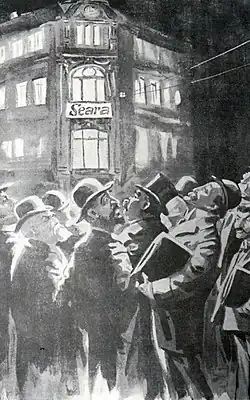 At the peak of Cantacuzino's negative campaign against the Conservative-Democrats, Seara also attacked private enterprises, including the Marmorosch Blank Bank. Bogdan-Pitești was taken to court by owner Aristide Blank, and N. Fleva organized his defense.[35] According to the records kept by Caragiale, Blank effectively set a "trap" with the cooperation of Romanian Police, and Bogdan-Pitești, found guilty of blackmail, was sentenced to nine months in prison.[34] Seara fared badly during the period, and was out of print by autumn 1913.[31][36]