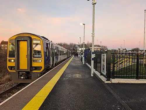 ![]() The station seen in January 2025, with a Class 158 at the platform. | |||||
