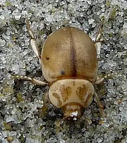 Although the underside of adult beetles is a pale whitish yellow in colour,[3] its hardened forewings (elytra) are polymorphic.[5] The colour of an individual matches that of the sand where it lives.[4] On beaches with black sand, around 96% of beetles are a brown-black colour. On beaches with pale sand, around 98% of beetles are a pale milky colour.[3] Spotted and mottled beetles have also been observed on beaches with mixed sand types.[5]
