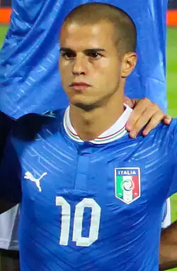 Giovinco started in the first game of Italy's 2014 FIFA World Cup qualification campaign against Bulgaria in Sofia, wearing the number 10 jersey;[189] the match ended in a 2–2 draw.[190] He scored his first goal for Italy in their 2013 FIFA Confederations Cup group stage match against Japan, wearing the number 10 shirt; in addition to scoring the match-winning goal, he also helped to win a penalty, which was converted by Mario Balotelli, and thus ensured a 4–3 win, which allowed Italy to progress to the semi-finals of the competition for the first time in their history.[191][192] In the semi-finals, Giovinco came on during the second half of extra time; the match ended 0–0 and went to penalties as Giovinco netted his spot kick for Italy, however, Spain won 7–6 due to Leonardo Bonucci's miss.[193] Italy subsequently won the bronze medal match against Uruguay, also on penalties, after the match had ended 2–2 after extra time.[194] Due to the lack of playing time during the 2013–14 season, Giovinco missed out on the 2014 World Cup and was not named in the provisional nor the final squad.[195]