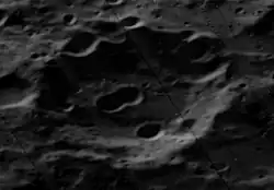 This crater has taken a moderate amount of wear and tear as a result of subsequent impacts. The outer rim is somewhat worn and uneven. There is a small crater intruding into the southwestern outer rim. A joined pair of small craters is located in the middle of the interior floor, and there is a small craterlet along the eastern base of the inner wall.