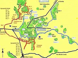The battle was the last Bolivian attempt to capture the heavily fortified stronghold of Nanawa, a salient in the southern front. By capturing Nanawa the Bolivian army hoped to isolate Isla Poí, the Paraguayan headquarters and main water supply point to the northeast, and ultimately reach the city of Concepción, on the Paraguay River. Nanawa (Enxet for "carob tree forest") had been founded as a small outpost in 1928 by Ivan Belaieff, a white Russian officer who joined the Paraguayan army in the 1920s. In December 1932 the Bolivian army took over a number of Paraguayan outposts between Nanawa and the Pilcomayo River, on the border with Argentina. Realising that a major offensive was looming, the fort's commander, Colonel Luis Irrazábal, built up a horseshoe-shaped defense facing west around the old outpost and gathered under his command four regiments and several minor units that made up the Paraguayan Fifth Division. On January 20, 1933, Nanawa was the subject of a massive Bolivian assault, which stalled after several days of heavy fighting and was eventually beaten back by the Paraguayan garrison. The Bolivian army suffered 2,000 casualties.[3] By March, Nanawa became the headquarters of the Paraguayan III Army Corps.[4]