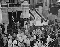 The assemblage then joined MacArthur in reciting the Lord's Prayer. While MacArthur spoke slivers of glass fell from the partially shattered glass-paneled roof. Rhee rose to express the gratitude of the Republic of Korea for the liberation of its capital city, he departed from his prepared text and stretching out his hands, clenching and unclenching them, spoke to that part of the audience made up of American soldiers, "How can I ever explain to you my own undying gratitude and that of the Korean people?" The short ceremony over, MacArthur left at once for Kimpo Airfield and at 13:35 departed for Tokyo.[3]: 538