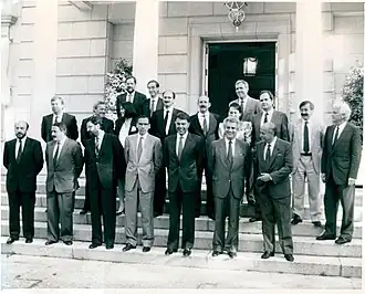 The cabinet comprised members of the PSOE (including its sister party, the Socialists' Party of Catalonia, PSC) and a number of independents. It was automatically dismissed on 30 October 1989 as a consequence of the 1989 general election, but remained in acting capacity until the next government was sworn in.[1][2][3]