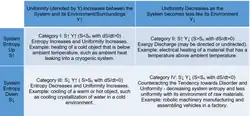 Consider a category IV example of robotic manufacturing and assembly of vehicles in a factory. The robotic machinery requires electrical work input and instructions, but when completed, the manufactured products have less uniformity with their surroundings, or more complexity (higher order) relative to the raw materials they were made from. Thus, system entropy or disorder decreases while the tendency towards uniformity between the system and its environment is counteracted. In this example, the instructions, as well as the source of work may be internal or external to the system, and they may or may not cross the system boundary. To illustrate, the instructions may be pre-coded and the electrical work may be stored in an energy storage system on-site. Alternatively, the control of the machinery may be by remote operation over a communications network, while the electric work is supplied to the factory from the local electric grid. In addition, humans may directly play, in whole or in part, the role that the robotic machinery plays in manufacturing. In this case, instructions may be involved, but intelligence is either directly responsible, or indirectly responsible, for the direction or application of work in such a way as to counteract the tendency towards disorder and uniformity.