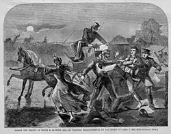 On the night of April 3, 1860, five federal marshals arrived at Frank Sanborn's home in Concord, Massachusetts, handcuffed him, and attempted to wrestle him into a coach and take him to Washington to answer questions before the Senate in regard to his involvement with John Brown. Approximately 150 townspeople rushed to Sanborn's defense. Judge Ebenezer R. Hoar issued a writ of replevin, formally demanding the surrender of the prisoner. In a letter to a friend, Louisa May Alcott wrote, "Sanborn was nearly kidnapped. Great ferment in town. Annie Whiting immortalized herself by getting into the kidnapper's carriage so that they could not put the long legged martyr in."[3]: 2196–2232