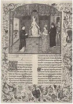 Secretum (De secreto conflictu curarum mearum, translated as The Secret or My Secret Book) is a trilogy of dialogues in Latin written by Petrarch sometime from 1342 to 1353,[1] in which he examines his faith with the help of Saint Augustine, and "in the presence of The Lady Truth".[2] Secretum was not circulated until some time after Petrarch's death, and was probably meant to be a means of self-examination during "the crisis of his middle years" more than a work to be published and read by others.[1]